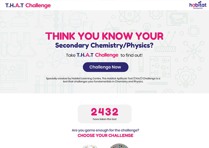 Habitat Learning Center wanted to launch an aptitude test (sales funnel) for secondary 3 & 4 students for leads generation, as well as to establish her new branding in the education industry. Since it is targeting students of age 15 and 16, the colour theme chosen are dark blue and pink which happens to be the corporate colours.